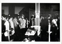 Scope and ContentBlack and white photograph of mourners around the open coffin of Blair Peach (teacher and anti-racism campaigner, severely injured by police after a protest against the National Front on 23 April 1979 who died the day after in hospital) in Dominion Cinema, Southall, with 'Southall Youth Movement remembers Blair Peach and Gurdid Singh Chaggar' banner in the background