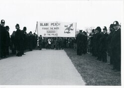 Scope and ContentBlack and white photograph of an Anti-Nazi League demonstration in Hyde Park, London, following death of Blair Peach. It shows a banner reading: Blair Peach. Fought the Nazis. Murdered by the police. There are lines of police officers on either side of a path