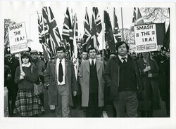 Scope and ContentBlack and white photograph of National Front marchers with anti-IRA placards during a counter-demonstration in Cardiff against the annual commemoration of Bloody Sunday. Martin Webster is front right and Andrew Brons is next to the woman holding the placard