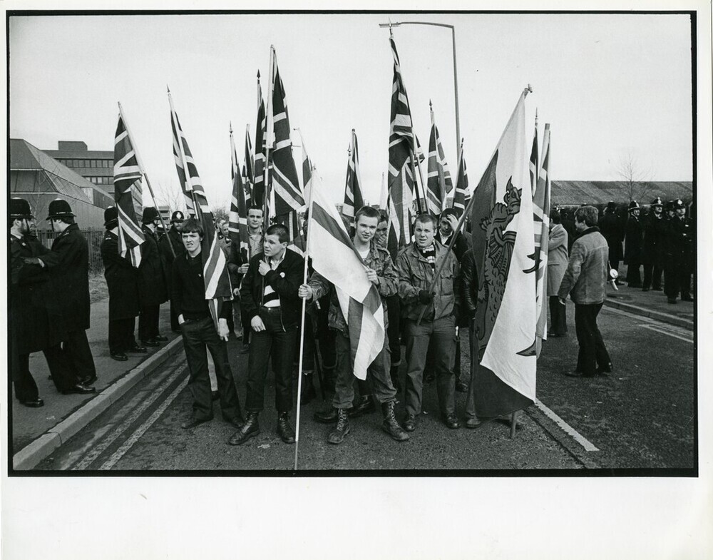 Scope and ContentBlack and white photograph of National Front marchers with Union Jacks, a Welsh flag and an English flag during a counter-demonstration in Cardiff against the annual commemoration of Bloody Sunday.