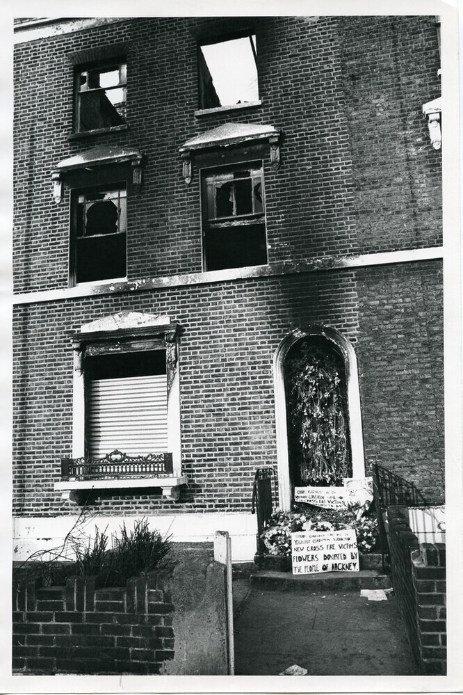 Scope and ContentBlack and white photograph of the burnt out house at 439 New Cross Road where 13 young people died in a fire on 18 Jan 1981. The front door and step are covered in flowers