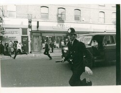 Scope and ContentBlack and white photograph of three police officers, one looking at the camera, running along street with a police van behind them [possibly Atlantic Road]