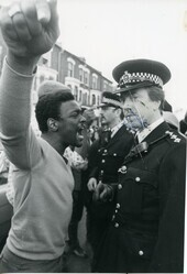 Scope and ContentBlack and white photograph of a man confronting a police officer in Brixton. The officer is looking at the camera