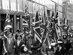 Scope and ContentBlack and white photograph of a National Front march with members wearing Remembrance poppies and being escorted by police officers. Martin Webster is on the far left