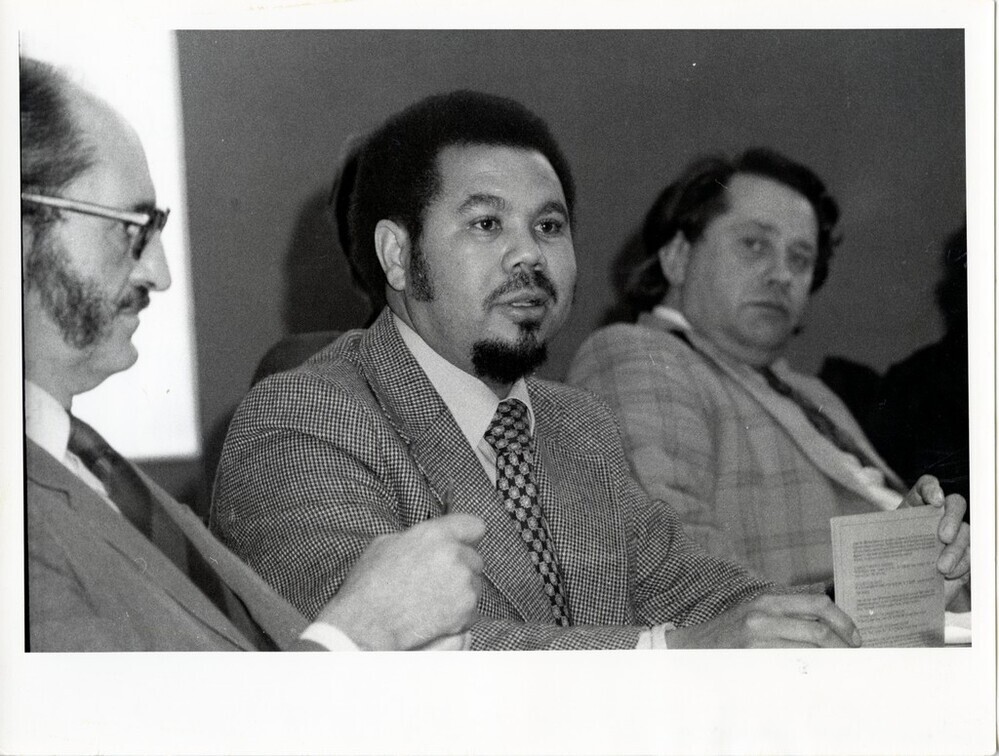 Scope and ContentBlack and white photograph of Lionel Morrison, Chairman of the National Union of Journalists sub-committee on Race Relations and later first black President of the National Union of Journalists with two other men