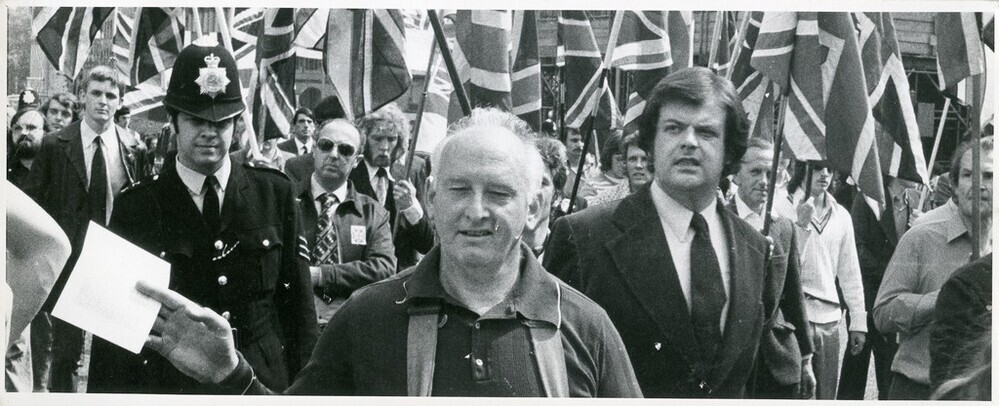 Scope and ContentBlack and white photograph of a National Front demonstration with a number of people carrying union jacks. Martin Webster is front right
