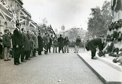 Scope and ContentBlack and white photograph of National Front members laying a wreath at the Cenotaph, Whitehall, London. Martin Webster is at the end of the line on the left holding a megaphone