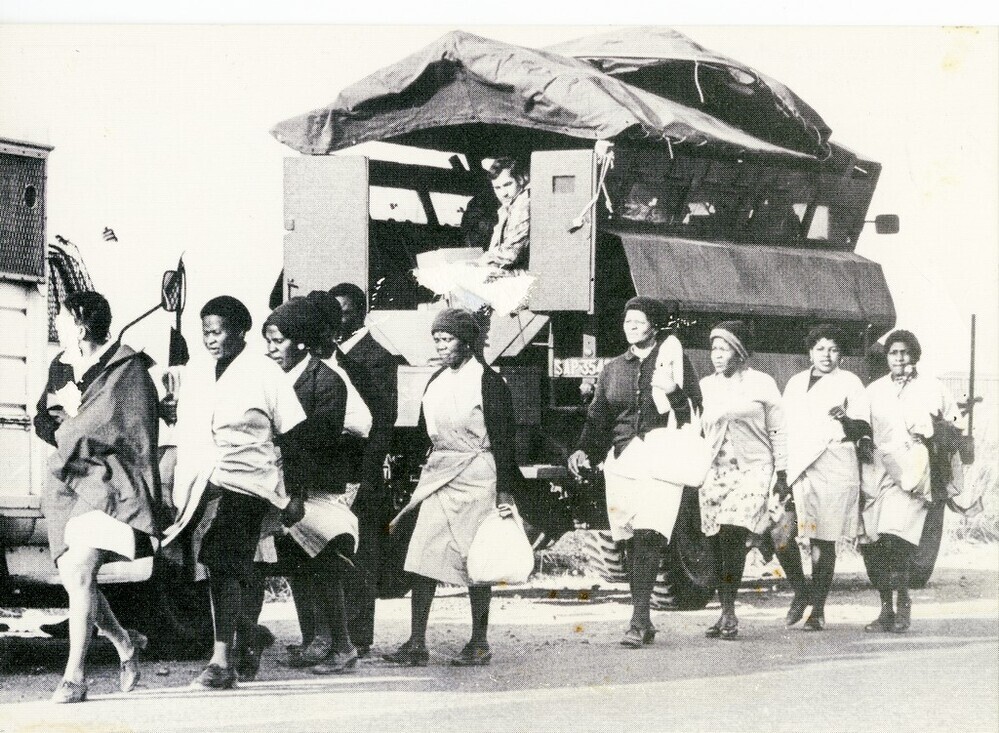 Scope and ContentBlack and white postcard showing nurses from Baragwanath Hospital for Blacks near Soweto. There is an armoured personnel carrier in the background. Number 6 in the Leeds Postcards series: Women in Apartheid South Africa
