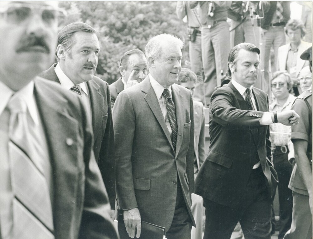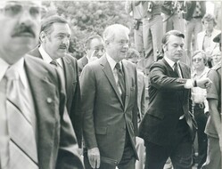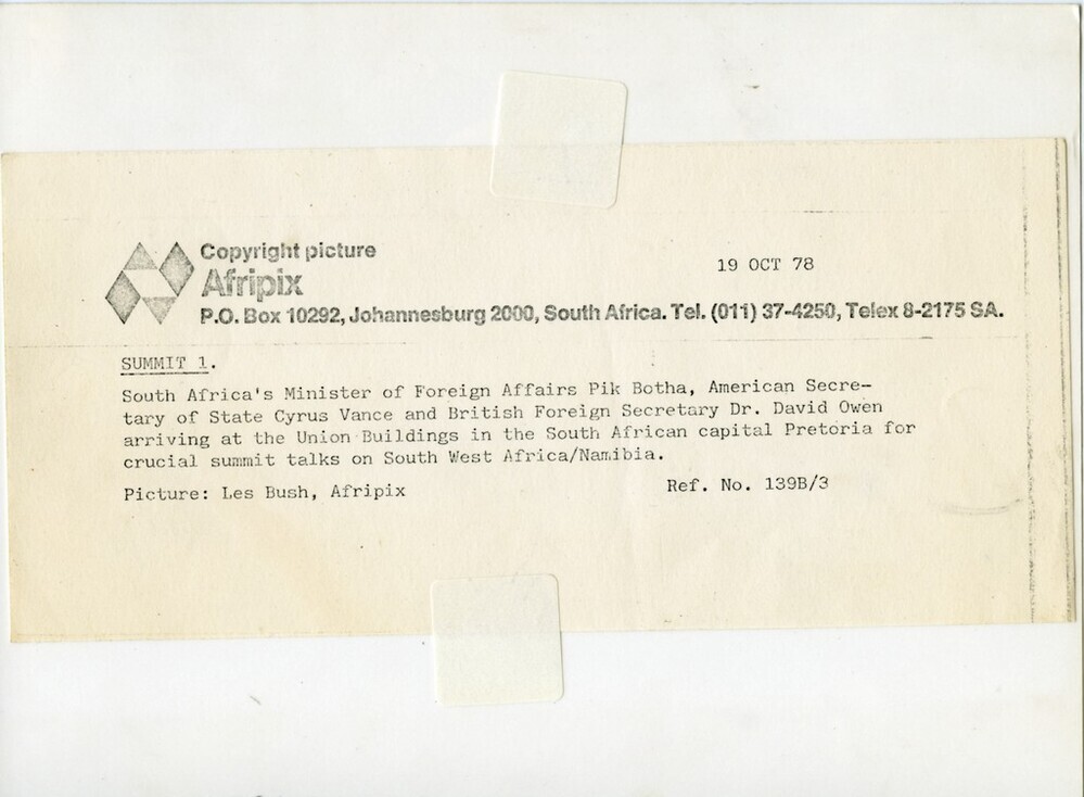 Scope and ContentBlack and white photograph of Pik Botha, Cyrus Vance and David Owen arriving at the Union Buildings in Pretoria for summit talks on South West Africa and Namibia