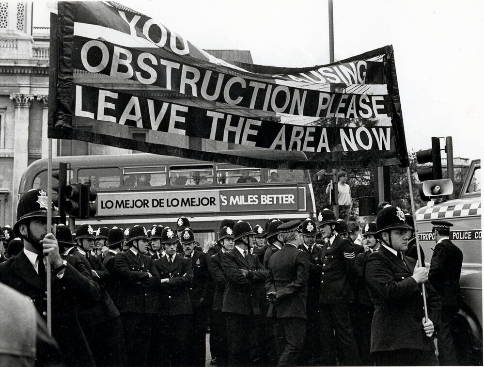 Scope and ContentBlack and white photograph of a large group of Metropolitan Police officers, two of whom are holding a large sign saying 'You are causing obstruction please leave the area now'. They are outside South Africa House during the National Union of Students Anti-Apartheid march.