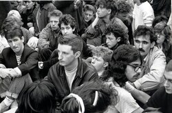 Scope and ContentBlack and white photograph of Billy Bragg (singer, songwriter and activist) and a large group of people waiting to be arrested during the National Union of Students Anti-Apartheid march in London.