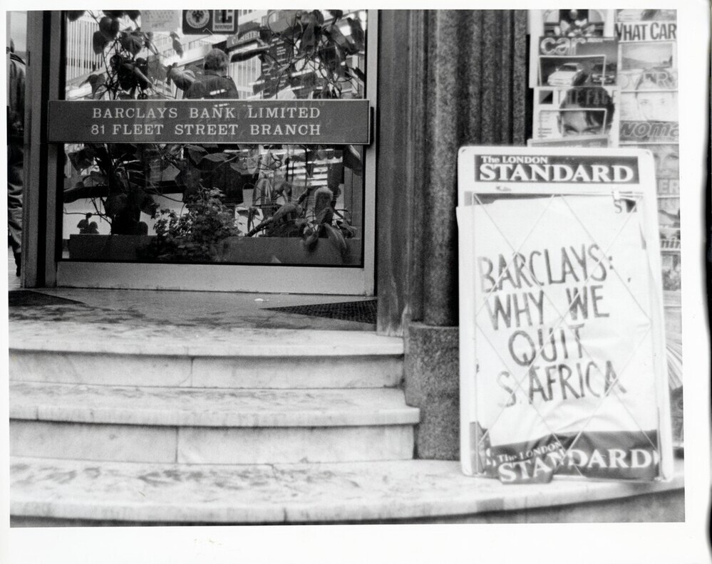 Scope and ContentBlack and white photograph of a London Standard news board outside Barclay Bank's Fleet Street branch reading: Barclays: why we quit S. Africa
