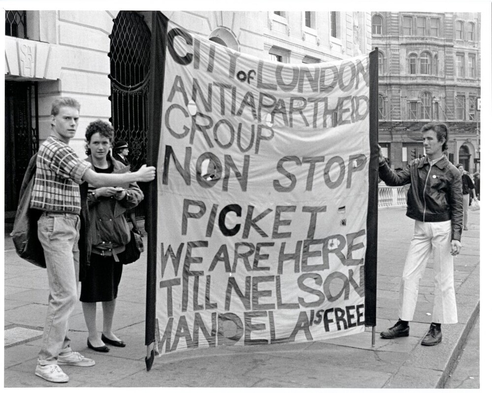 Scope and ContentBlack and white photograph of the City of London Anti-Apartheid Group holding a 24 hour vigil outside South Africa House, London. It shows three people with a banner reading: City of London Anti-Apartheid Group non stop picket. We are here till Nelson Mandela is free.