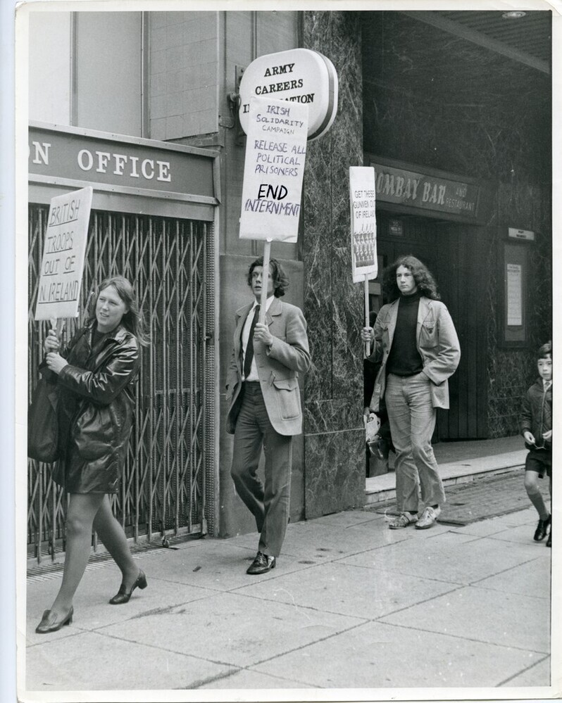 Scope and ContentBlack and white photograph of three people walking along a street holding placards as part of an end internment picket of an Army recruiting office in Glasgow.