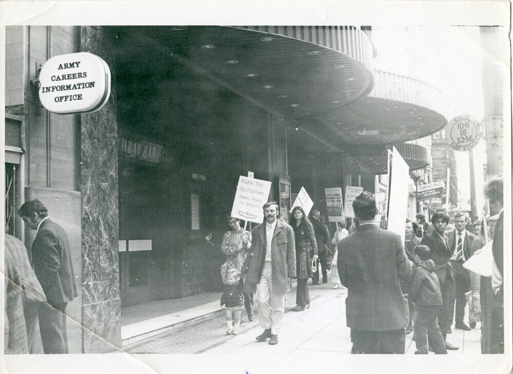 Scope and ContentBlack and white photograph of people walking along a street holding placards as part of an end internment picket of an Army recruiting office in Glasgow.
