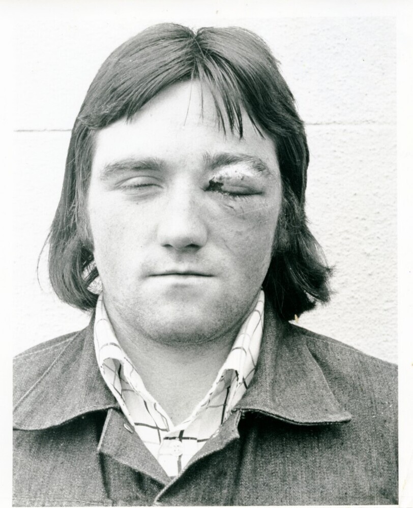 Scope and ContentBlack and white photograph of a young Belfast man with a rubber bullet wound to the eye