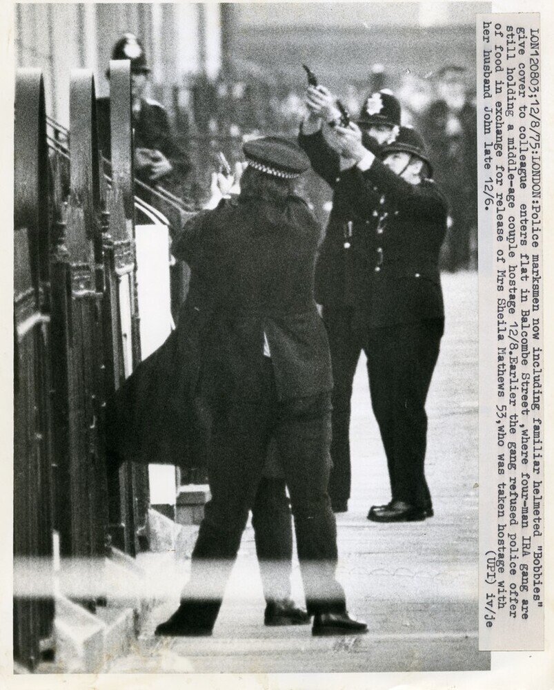 Scope and ContentBlack and white photograph of armed police officers during the siege of 22b Balcombe Street, Marylebone, where four suspected IRA bombers were holding John and Sheila Matthews hostage. There are five police officers and at lease three of them are holding guns