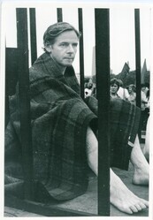 Scope and ContentBlack and white photograph of a barefoot man wrapped in a blanket in a cage at a Support H-Block prisoners rally, Hyde Park, London