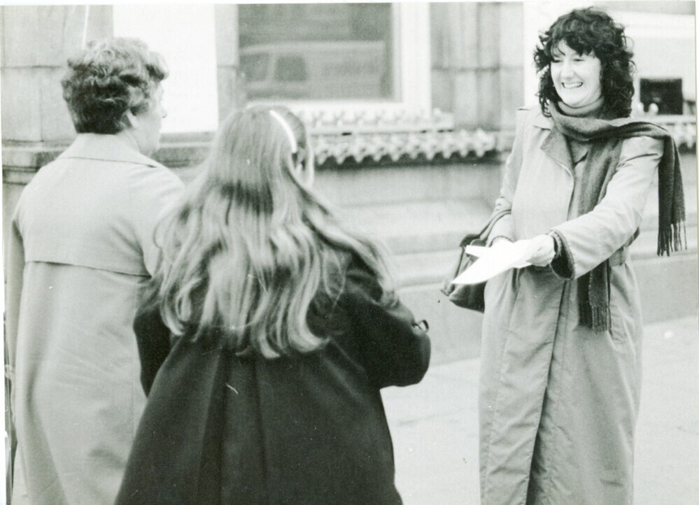 Scope and ContentBlack and white photograph of a woman handing out contraceptives in Dundalk, Ireland, flouting the Family Planning Act in Ireland which restricted the availability of contraceptives.