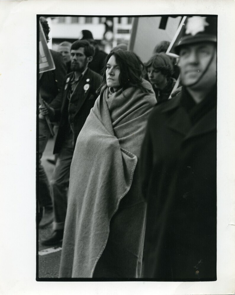 Scope and ContentBlack and white photograph of a woman wrapped in blanket at a demonstration in support of Irish prisoners, London.