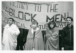 Scope and ContentBlack and white photograph of three people wrapped in blankets at a demonstration in London in support of Irish republican prisoners. There is a banner behind them reading: Victory to the H-block men. Political status now!