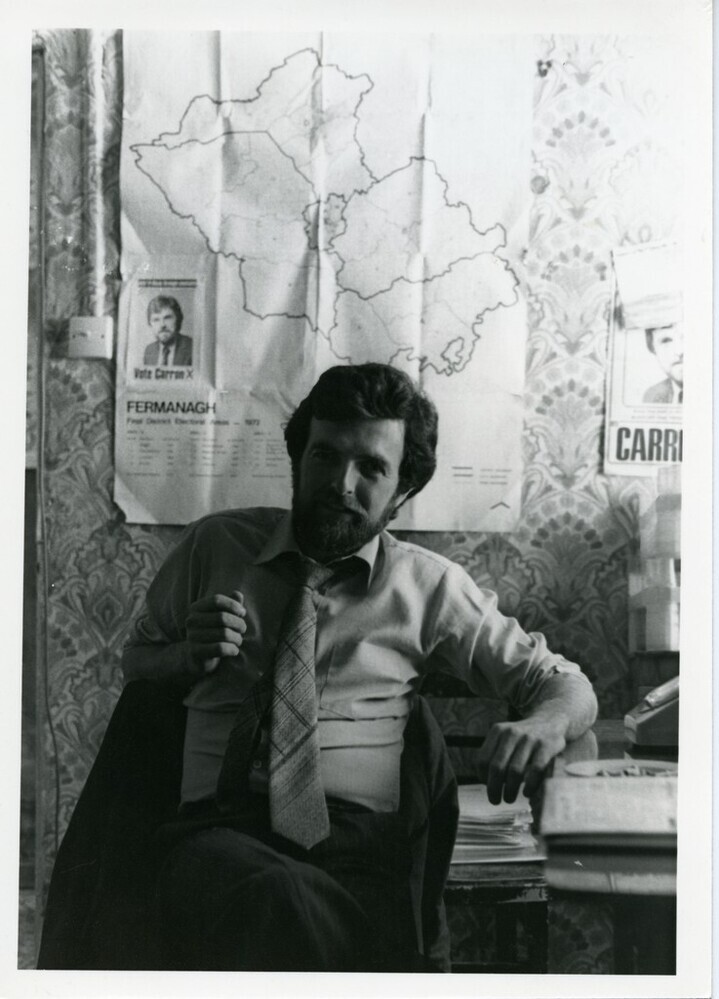 Scope and ContentBlack and white photograph of Owen Carron (Irish Republican, MP for Fermanagh and South Tyrone 1981-1983) sitting beneath a map of his constituency