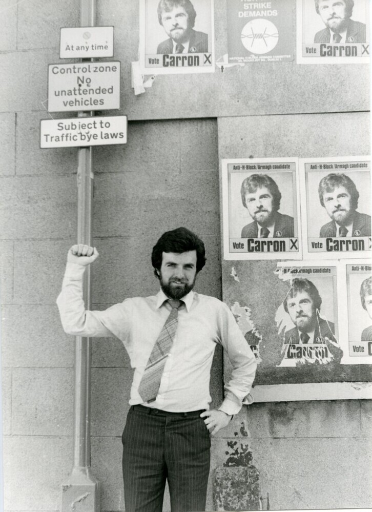 Scope and ContentBlack and white photograph of Owen Carron (Irish Republican, MP for Fermanagh and South Tyrone 1981-1983) giving a clenched fist salute