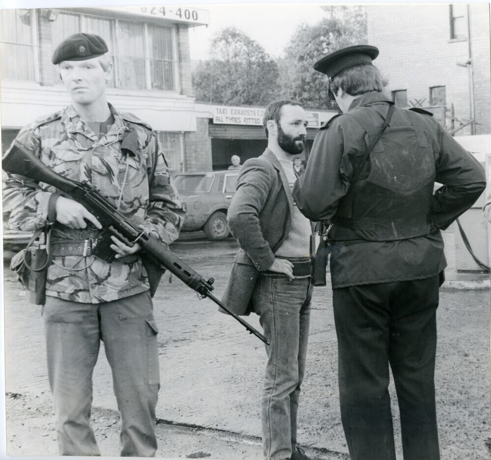 Scope and ContentBlack and white photograph of Alex Maskey (later first Sinn Fein Lord Mayor of Belfast) with an armed British soldier and a Royal Ulster Constabulary officer. The caption on the back reads: Alex Maskey being harassed by Brits and RUC, Anderstown Road, West Belfast