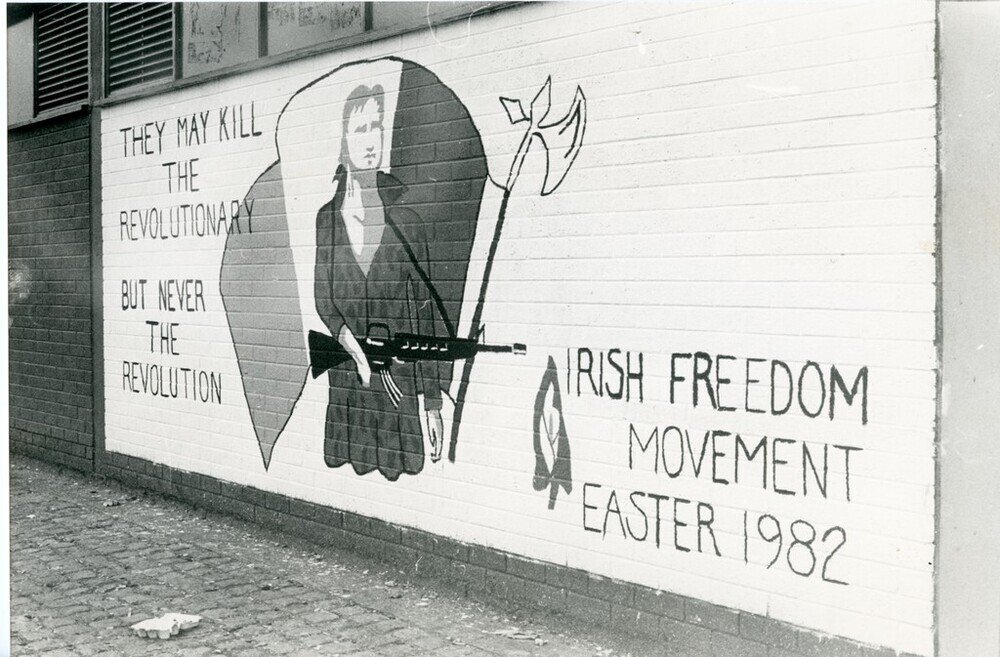 Scope and ContentBlack and white photograph of an Irish Freedom Movement mural showing a man holding an automatic weapon with a tricolour flag behind him. The text reads: They may kill the revolutionary, but never the revolution. Irish Freedom Movement, Easter 1982
