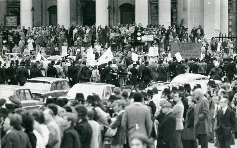 Scope and ContentBlack and white photograph of a demonstration in support of free speech on Northern Ireland, London. It shows the demonstrators on the steps of St Martin in the Fields Church in Trafalgar Square