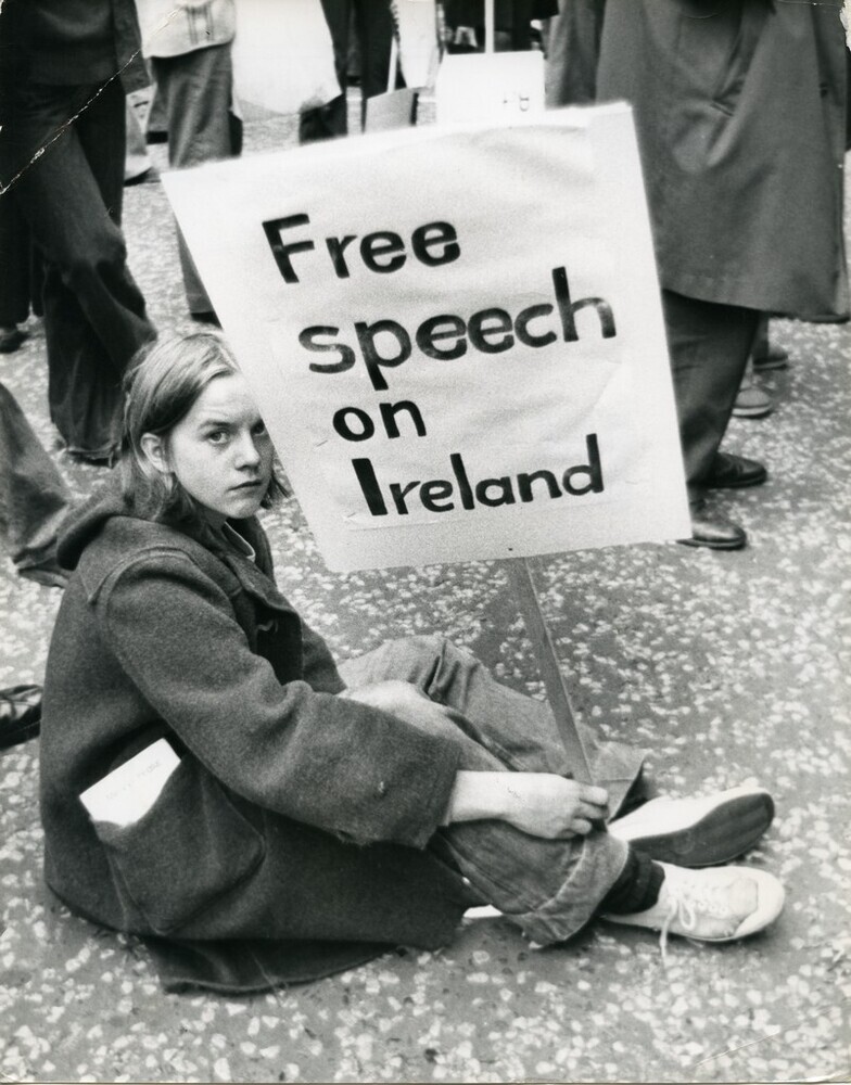 Scope and ContentBlack and white photograph of demonstrator sitting on the ground with a Free speech on Ireland placard.