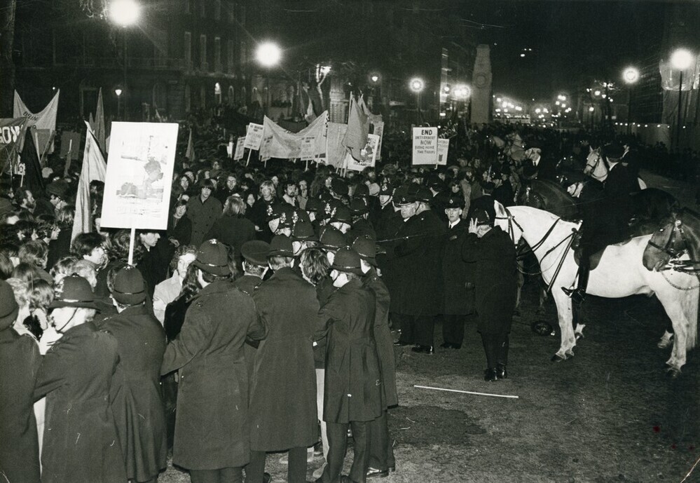 Scope and ContentBlack and white photograph of End interment demonstrators with placards and banners surrounded by police officers, London