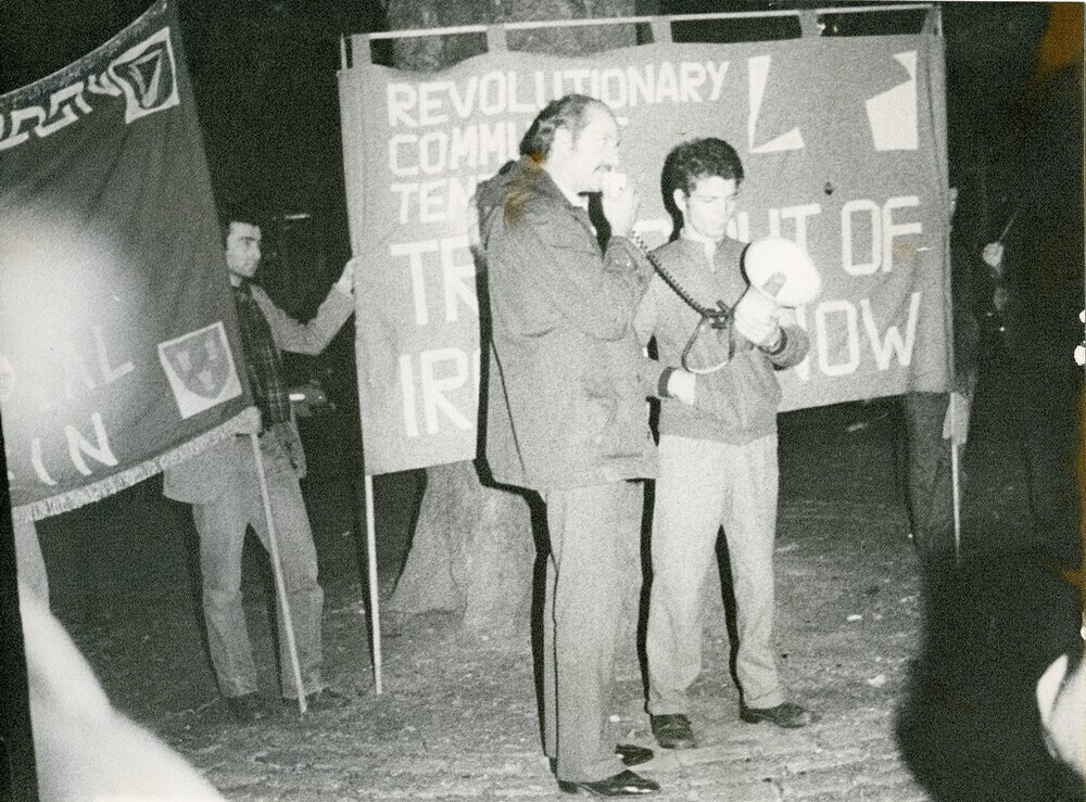 Scope and ContentBlack and white photograph of a Troops Out of Northern Ireland demonstration, London. Wally Heaton is speaking into a megaphone and standing in front of a Revolutionary Communist Tendency banner