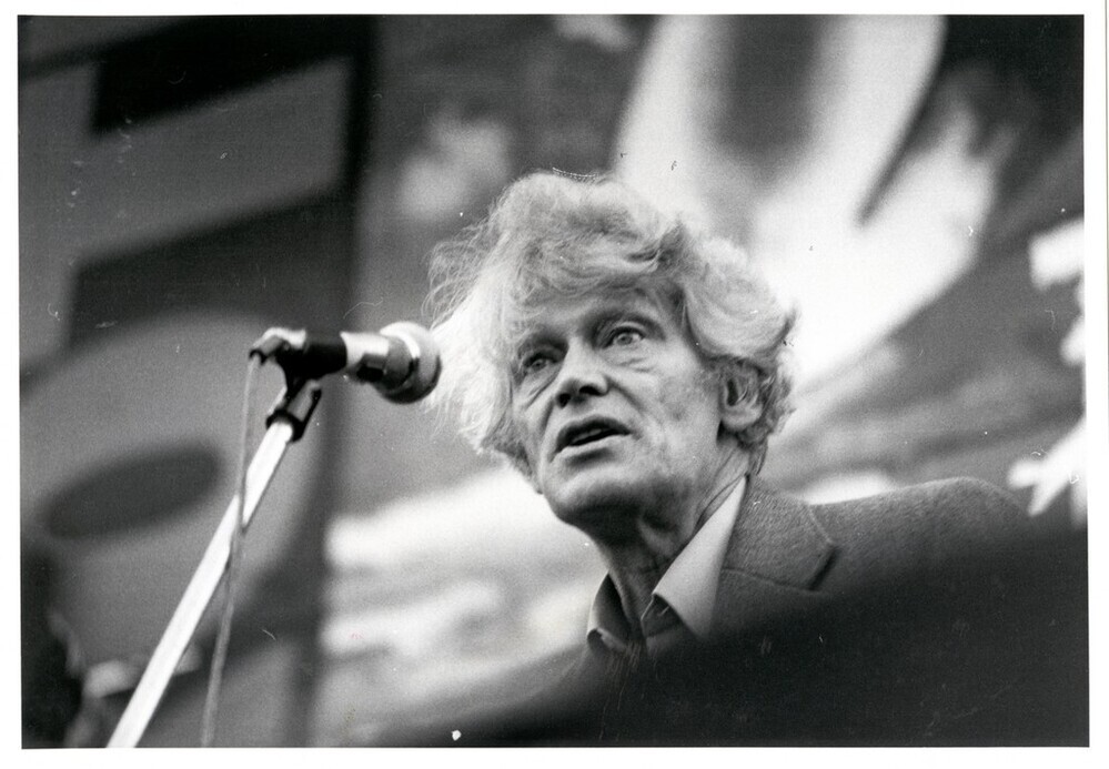 Scope and ContentBlack and white photograph of EP Thompson, historian, speaking at a CND Protest and Survive demonstration in Trafalgar Square, London.