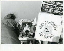 Scope and ContentBlack and white photograph of a group of protesters sitting on a tractor, with a Nuclear Power, No Thanks placard in the foreground. Caption on the back reads: Monday 13th Nov 1978. Non-violent direct action at Torness. Members of the Torness Alliance occupy a bulldozer to prevent it starting work on the SSEB's proposed new nuclear power station.