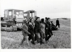 Scope and ContentBlack and white photograph of members of the Torness Alliance walking in front of bulldozers at the site of Torness Nuclear Power Station while attempting to prevent work on the proposed nuclear power station.