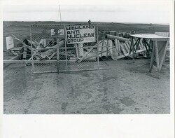 Scope and ContentBlack and white photograph of a Highland Anti Nuclear Group banner attached to a fence at a storage area, Torness