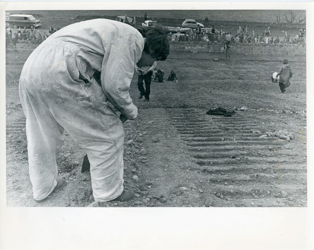 Scope and ContentBlack and white photograph of a man standing over the tracks of bulldozer looking down. There are other people in the background