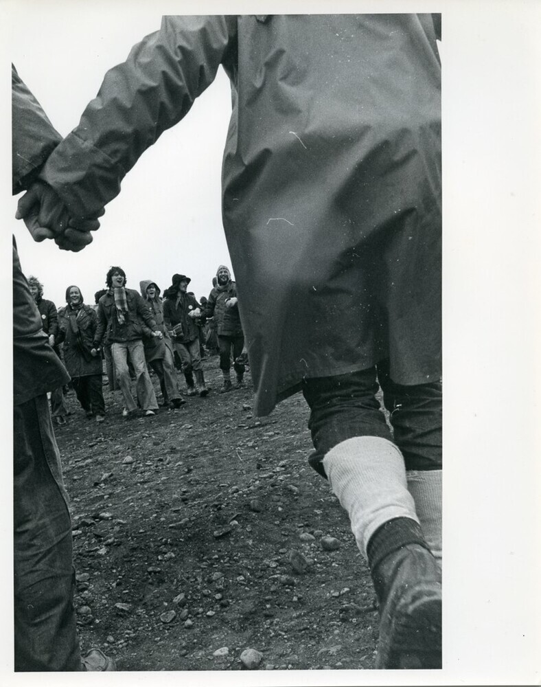 Scope and ContentBlack and white photograph of a group of people dancing in circle at a Torness anti-nuclear protest