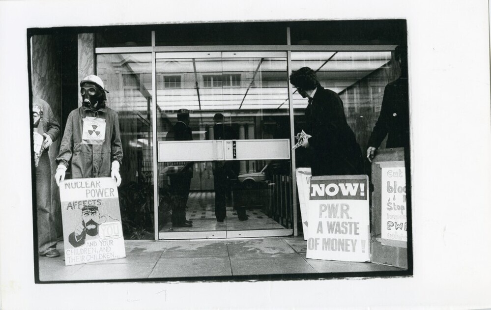 Scope and ContentBlack and white photograph of a Students against Nuclear Energy picket outside the General Electric Company Headquarters, London to mark the second anniversary of the Harrisburg near 'melt-down'. There are two men, one is wearing a gas mask and a boiler suit, the other is looking back through the doors of the building. Both have placards propped against them