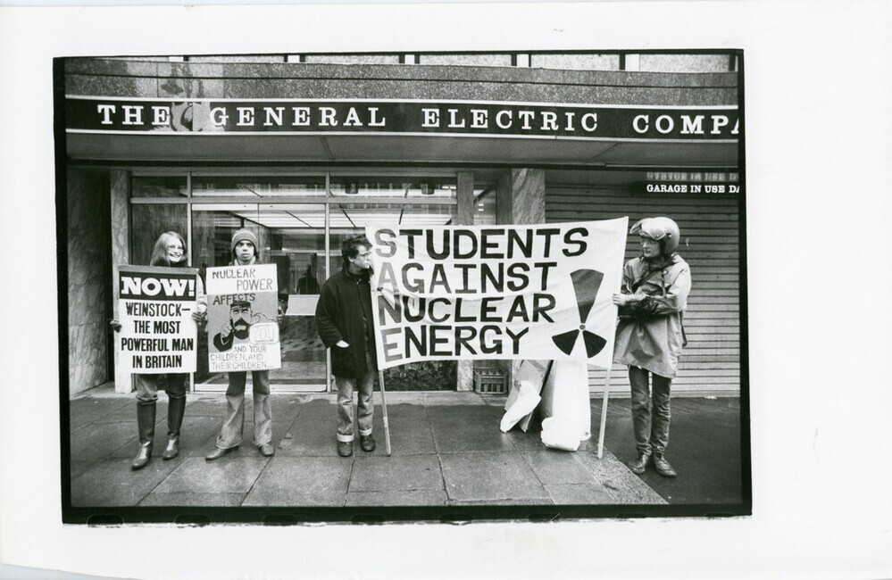 Scope and ContentBlack and white photograph of a Students against Nuclear Energy picket outside the General Electric Company Headquarters, London to mark the second anniversary of the Harrisburg near 'melt-down'. Four pickets are holding placards and a banner