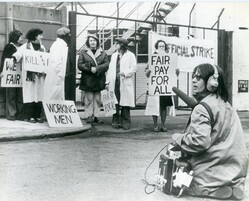 Scope and ContentBlack and white photograph of The London Women's Film Group filming The Amazing Equal Pay Show
