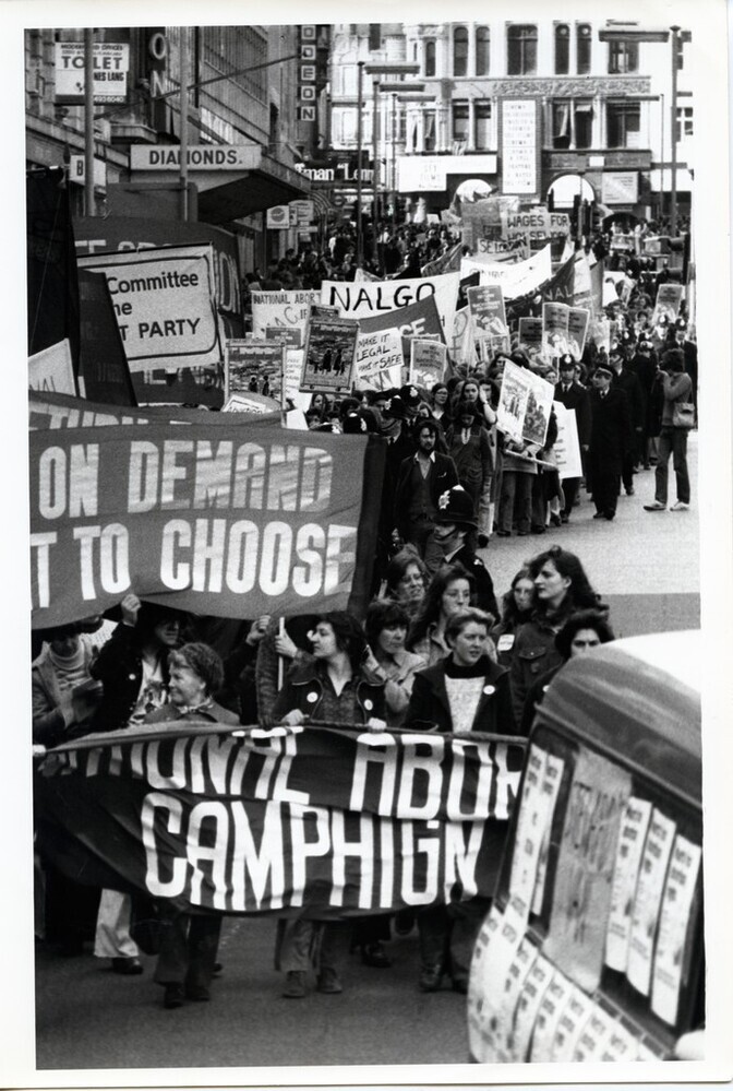 Scope and ContentBlack and white photograph of marchers at a National Abortion Campaign demonstration. There are a large number of banners and placards being held aloft. Caption on the back reads: Over 10,000 marched from Speakers Corner to Trafalgar Square