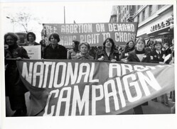 Scope and ContentBlack and white photograph of marchers at a National Abortion Campaign demonstration. In the foreground there is a group of women holding up a banner reading: National Abortion Campaign. Caption on the back reads: Over 10,000 attended march from Speakers Corner to Trafalgar Square