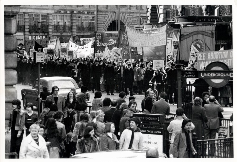 Scope and ContentBlack and white photograph of National Abortion Campaign supporters marching through Piccadilly Circus. They are flanked by a line of police officers The caption on the back reads: National Abortion Campaign march/rally. Speakers Corner - Trafalgar Sq. Speakers included Jo Richardson MP and Maureen Colquhon MP