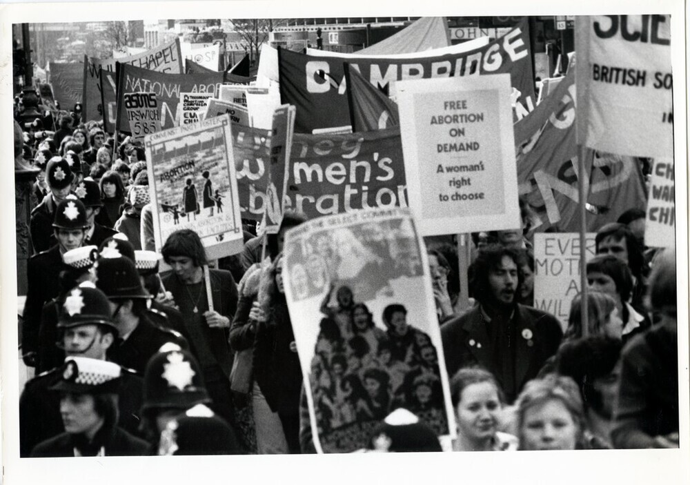 Scope and ContentBlack and white photograph of National Abortion Campaign supporters marching with a large number of banners and placards