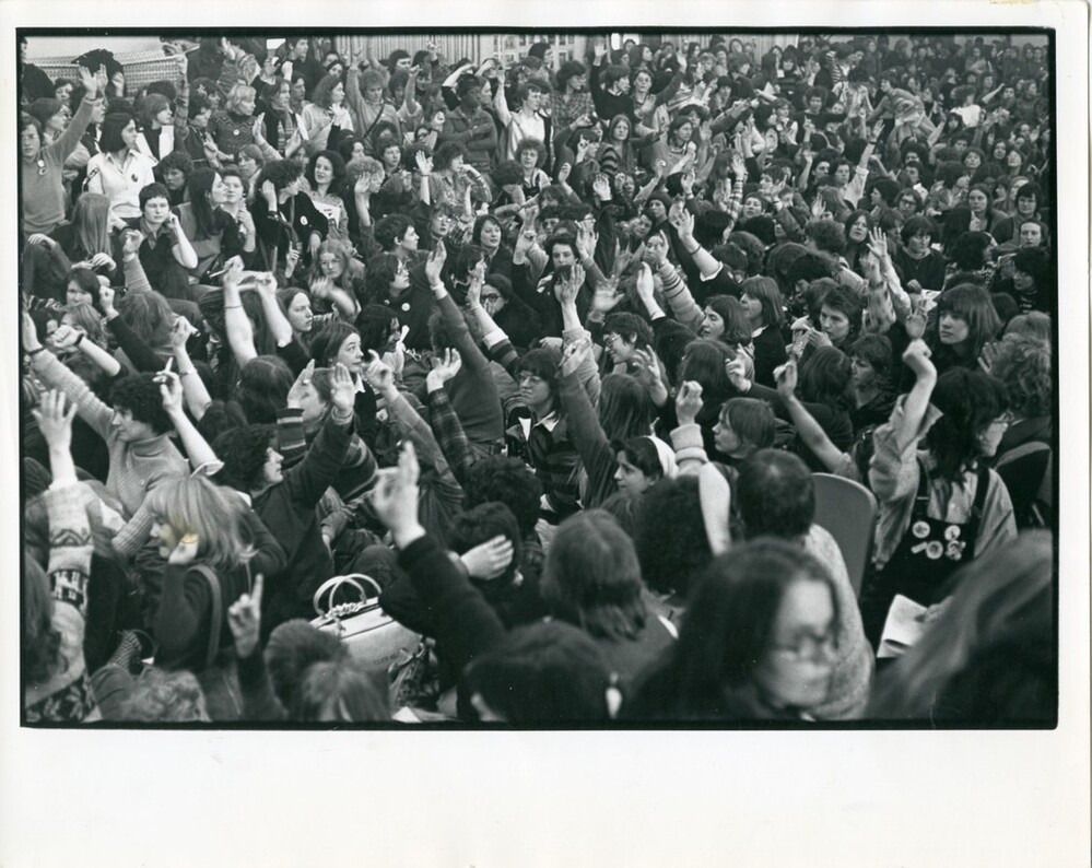 Scope and ContentBlack and white photograph of delegates voting at the plenary session of the 10th National Women's Liberation Conference, Ladywood School, Birmingham.
