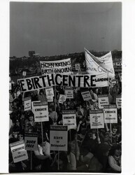 Scope and ContentBlack and white photograph of a large group of protesters holding placards and banners. 5000 people marched to Hampstead Heath in London in support of women's right to active birth