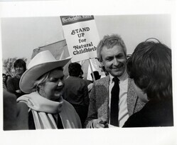 Scope and ContentBlack and white photograph of a woman and a man. The man is holding a placard reading: Stand up for Natural Childbirth. 5000 people marched to Hampstead Heath in London in support of women's right to active birth.