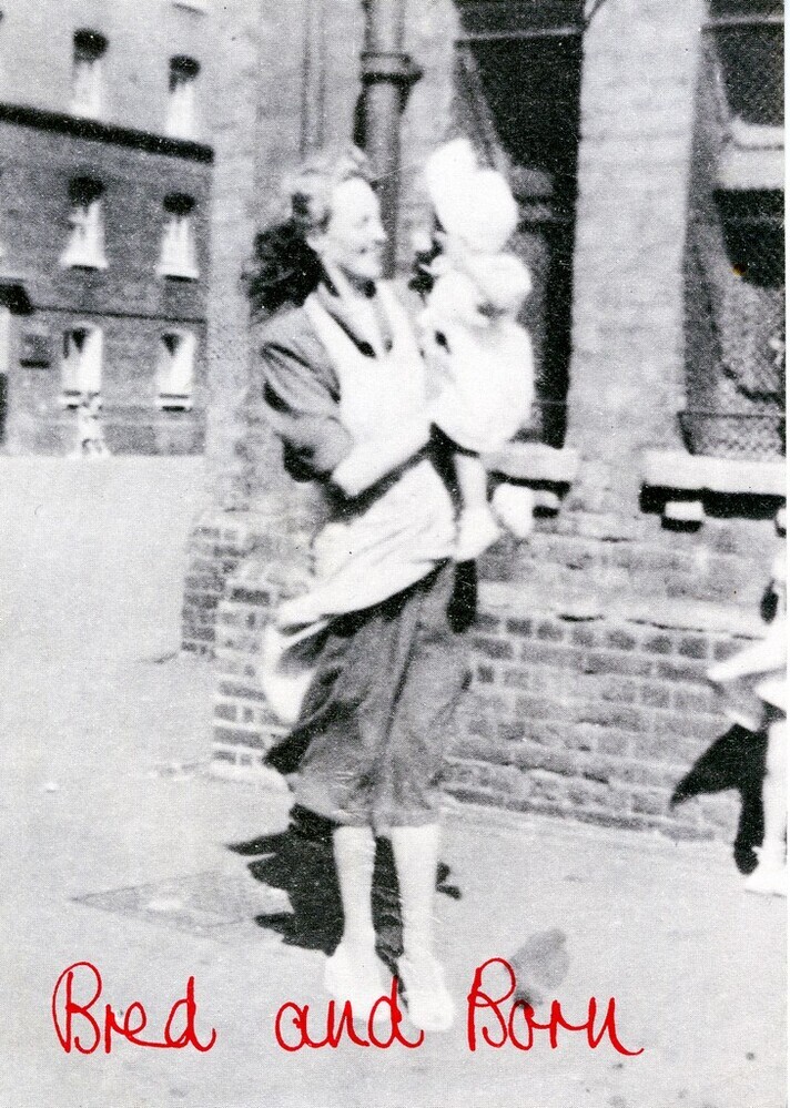 Scope and ContentBlack and white postcard advertising 'Bred and Born', a 75 minute film by Joanna Davis and Mary Pat Leece, about motherhood and class in Tower Hamlets, shown on Channel Four's 'Eleventh Hour'.